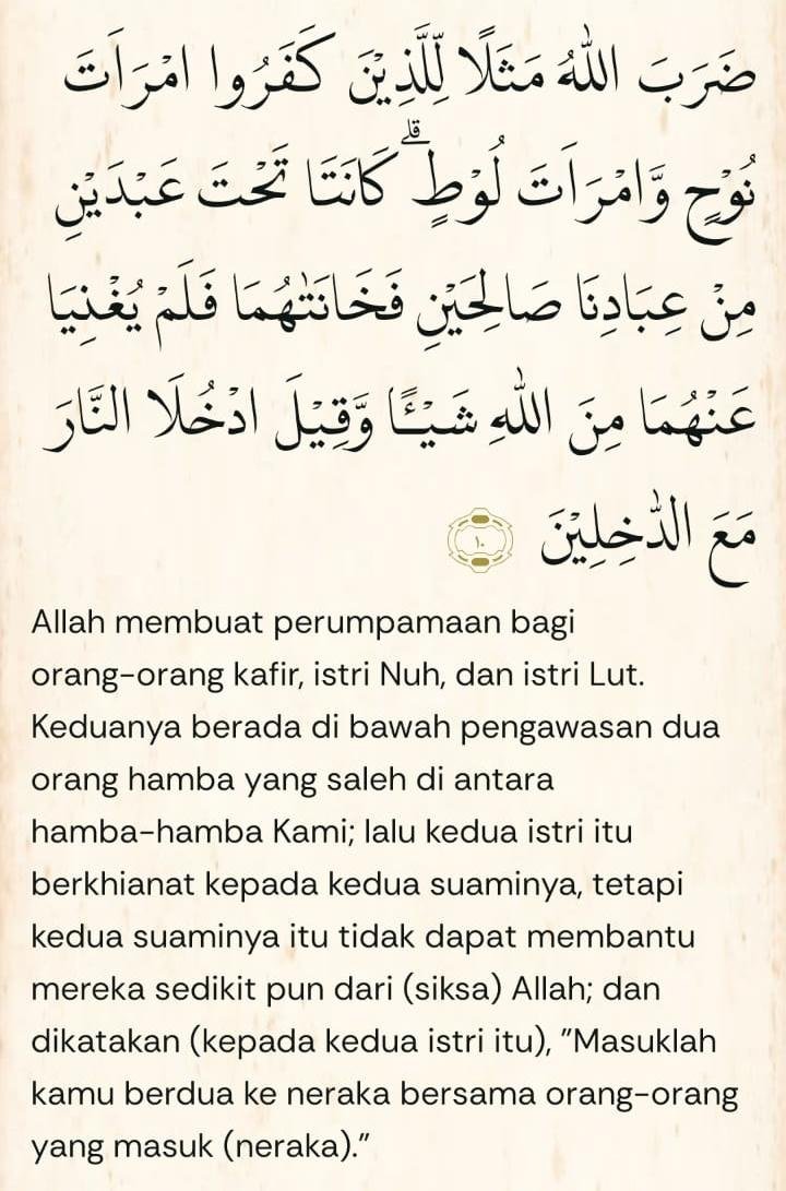 Dalam surat at-Tahrim ayat 10, Allah menjelaskan bahwa istri Nabi Nuh dan istri Nabi Luth, mereka telah mengkhianati suami mereka.