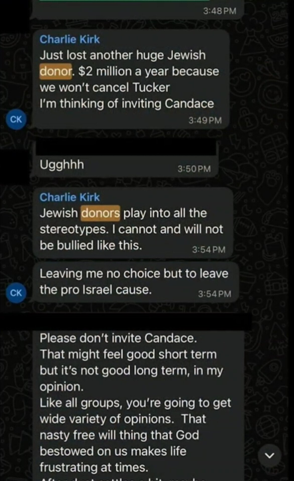 Dalam tangkapan layar chat WA yang dibagikan Candace Owens, Charlie Kirk mengungkapkan: