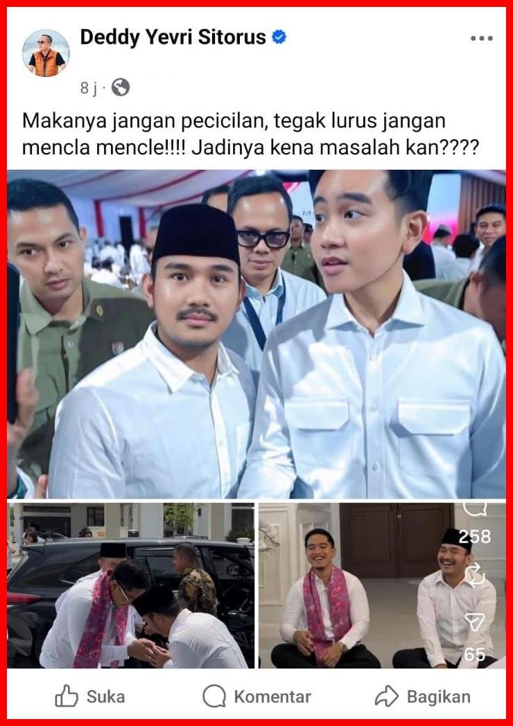Deddy Yevri Sitorus, politikus PDIP yang saat ini menjabat sebagai anggota DPR RI periode 2024–2029, memposting foto Bupati Bekasi Ade Kuswara (kader PDIP yang baru saja kena OTT KPK) foto bersama Wapres Gibran dan Ketum PSI Kaesang.