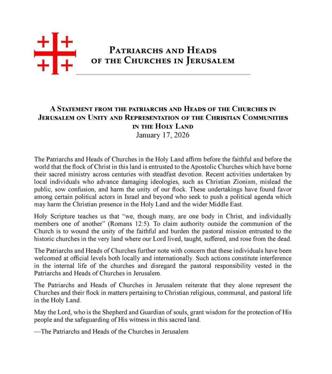 Dalam pernyataan bersama tertanggal 17 Januari 2026, para pemimpin gereja mengatakan bahwa umat Kristen di Tanah Suci dipercayakan kepada gereja-gereja yang telah menjalankan pelayanan mereka “selama berabad-abad dengan pengabdian yang teguh.” Mereka memperingatkan terhadap tindakan individu-individu lokal yang memajukan ideologi seperti Zionisme Kristen, dengan mengatakan bahwa upaya-upaya tersebut menabur kebingungan di dalam komunitas Kristen dan mengancam persatuan mereka.