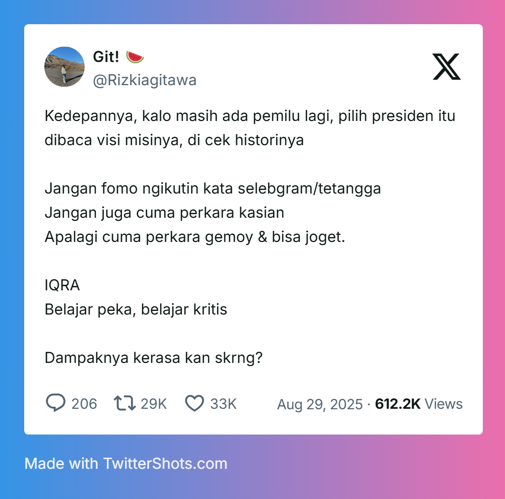 Kedepannya, kalo masih ada pemilu lagi, pilih presiden itu dibaca visi misinya, di cek historinya