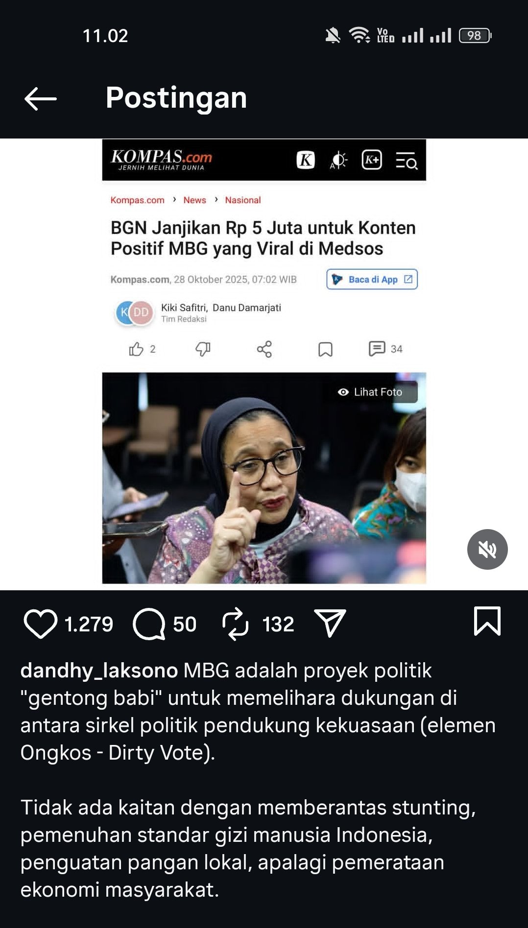 Melaui unggahan instagramnya mengkritik kebijakan kepala BGN dengan menuliskan, “MBG adalah proyek politik “gentong babi” untuk memelihara dukungan di antara sirkel politik pendukung kekuasaan (elemen Ongkos – Dirty Vote). Tidak ada kaitan dengan memberantas stunting, pemenuhan standar gizi manusia Indonesia, penguatan pangan lokal, apalagi pemerataan ekonomi masyarakat.”