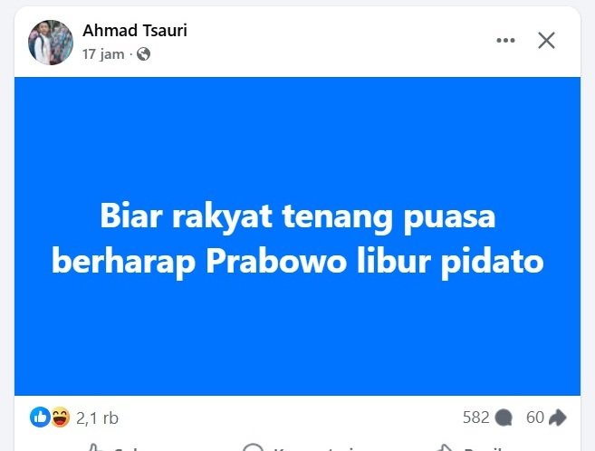 “Biar rakyat tenang puasa berharap Prabowo libur pidato,” ungkap Ahmad Tsauri di media sosial facebook yang mendapat ribuan like dari netizen.