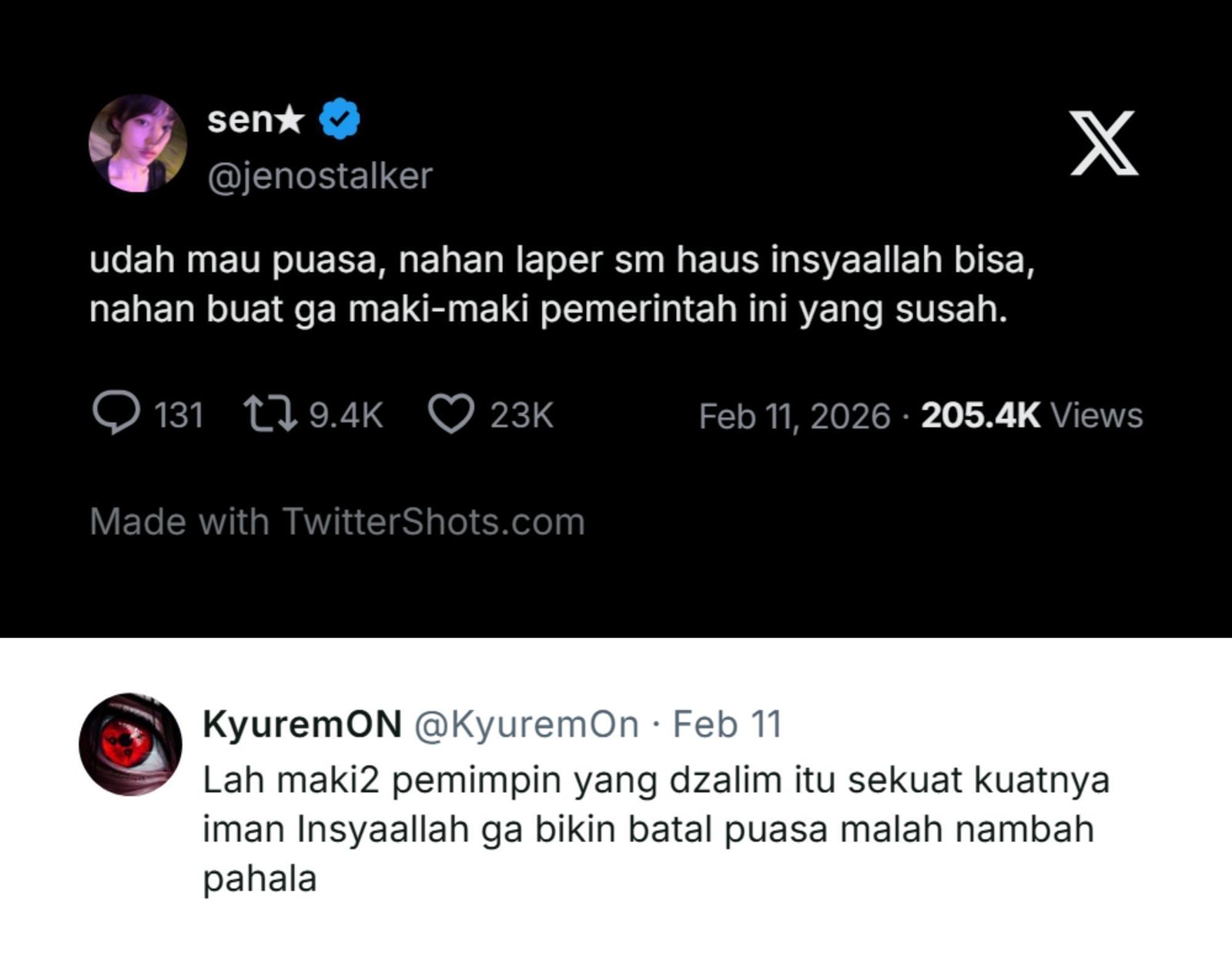 “udah mau puasa, nahan laper sm haus insyaallah bisa, nahan buat ga maki-maki pemerintah ini yang susah,” cuit netizen X @jenostalker.