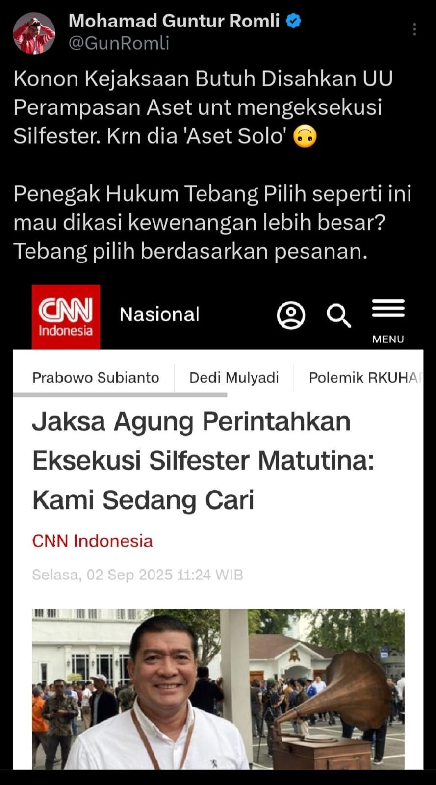 “Konon Kejaksaan Butuh Disahkan UU Perampasan Aset unt mengeksekusi Silfester. Karena dia ‘Aset Solo‘ 🙃,” komen Jubir PDIP Mohamad Guntur Romli @GunRomli.