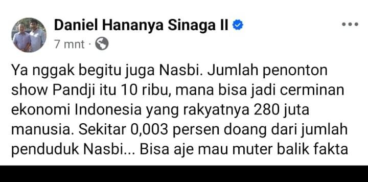 “Ya nggak begitu juga Nasbi. Jumlah penonton show Pandji itu 10 ribu, mana bisa jadi cerminan ekonomi Indonesia yang rakyatnya 280 juta manusia. Sekitar 0,003 persen doang dari jumlah penduduk Nasbiβ¦ Bisa aje mau muter balik fakta,” sentil Daniel Hananya Sinaga.