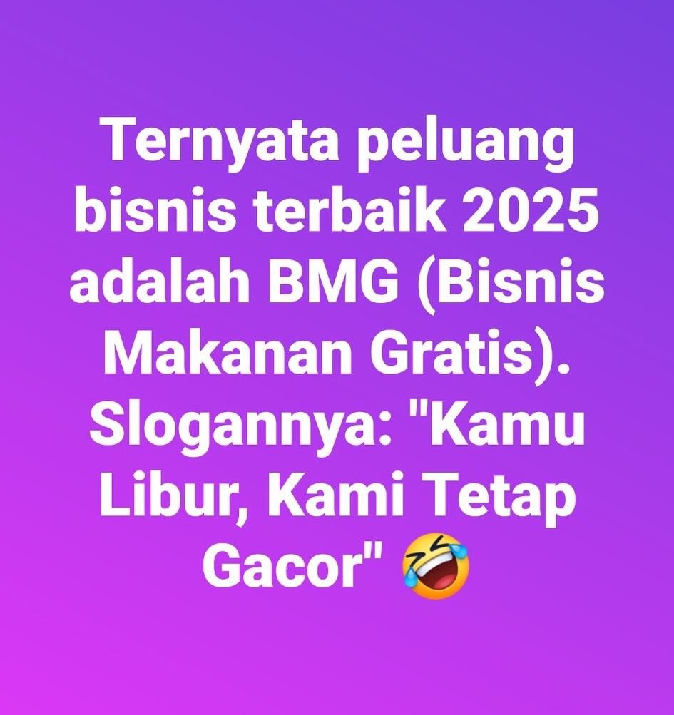 Ternyata peluang bisnis terbaik 2025 adalah BMG (Bisnis Makanan Gratis). Slogannya: