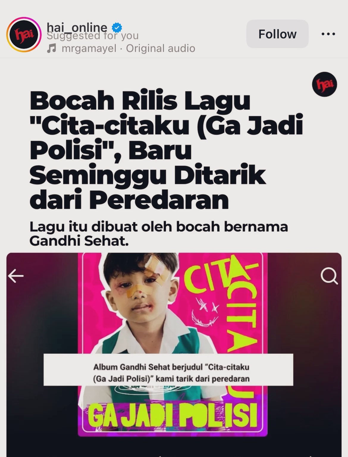 Lagu “Cita-citaku (Ga Jadi Polisi)” milik penyanyi cilik asal Sleman (DI Yogyakarta) Gandhi Sehat resmi ditarik dari peredaran.