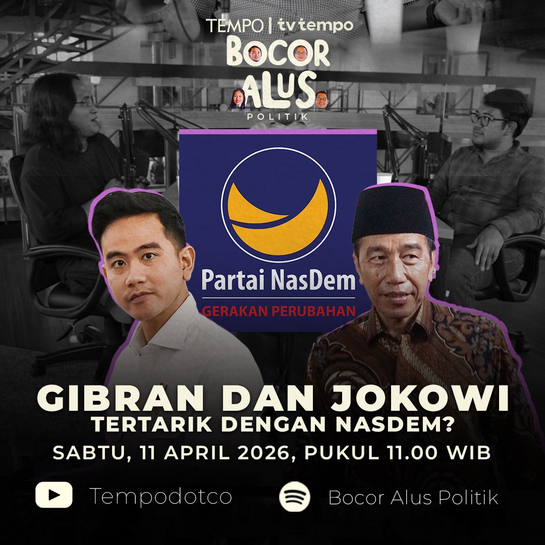Bocor alus TEMPO di podcast terbaru yang tayang hari ini, Ahad (11/4/2026), mengungkap info eksklusif bahwa Ketua Umum Partai Gerindra yang saat ini menjabat Presiden RI Prabowo Subianto dan Ketua Umum Partai NasDem Surya Paloh bertemu secara pribadi. Obrolan keduanya memunculkan gagasan menggabungkan dua partai yang lahir dari rahim yang sama, Partai Golkar.