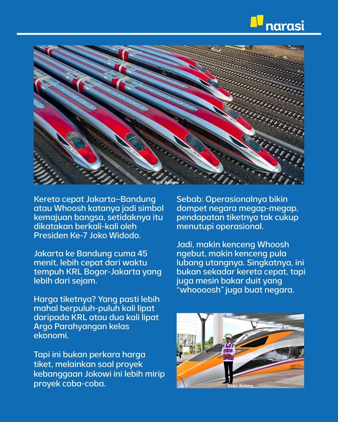 Jadi. makin kenceng Whoosh ngebut, makin kenceng pula lubang utangnya. Singkatnya, ini bukan sekadar kereta cepat, tapi juga mesin bakar duit yang “whoooosh” juga buat negara.