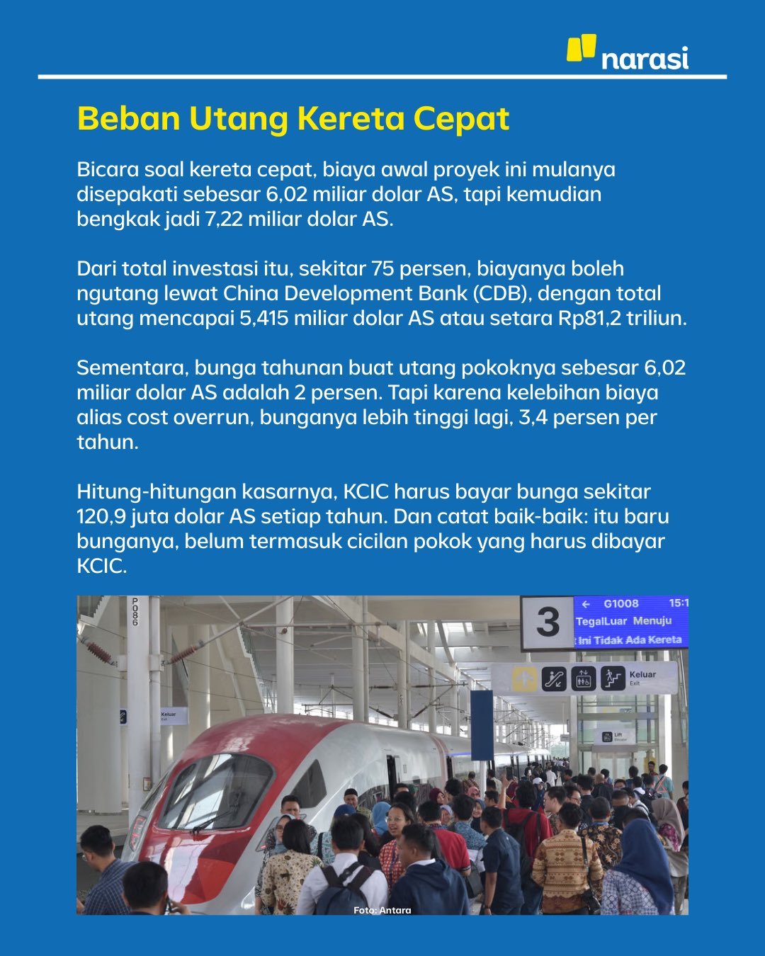 Dari total investasi itu, sekitar 75 persen, biayanya boleh ngutang lewat China Development Bank (CDB), dengan total utang mencapai 5,415 miliar dolar AS atau setara Rp81,2 triliun.