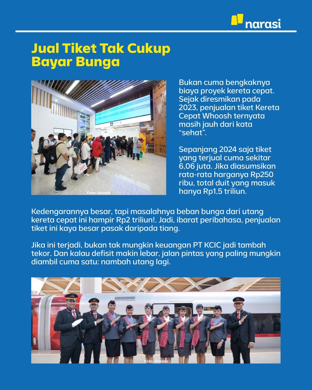 Kedengarannya besar, tapi masalahnya beban bunga dari utang kereta cepat ini hampir Rp2 triliun! Jadi, ibarat peribahasa, penjualan tiket ini kaya besar pasak daripada tiang.