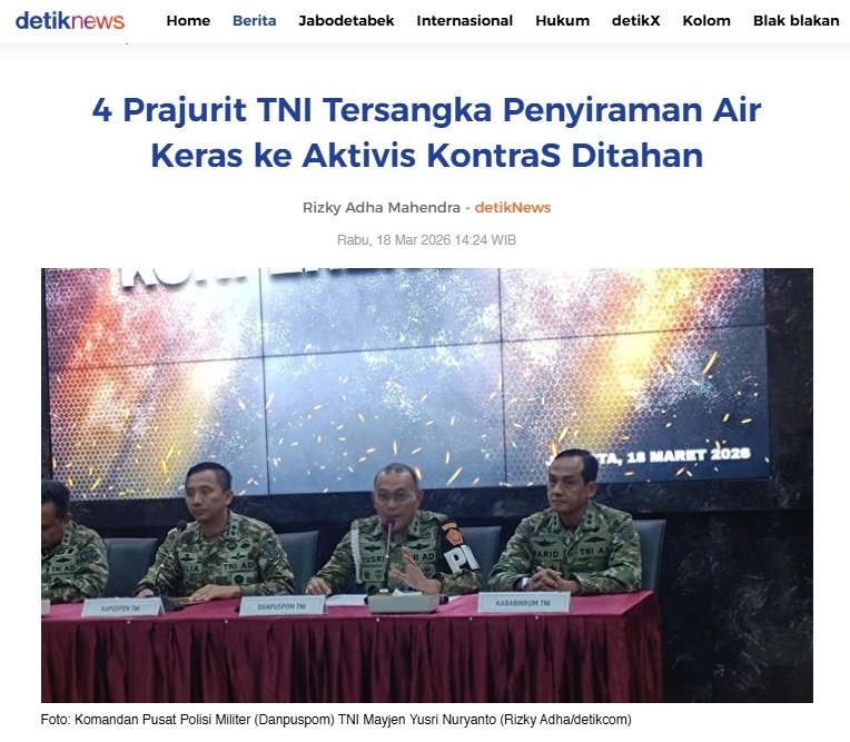 Puspom TNI mengamankan empat anggota TNI yang diduga melakukan penyiraman air keras kepada aktivis KontraS, Andrie Yunus.