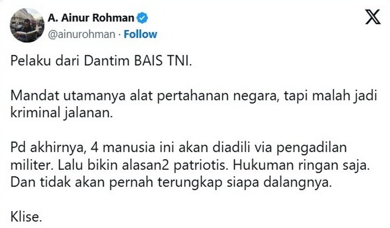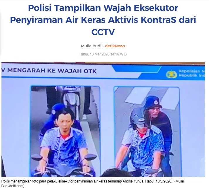 “Tadi pagi saya telah menerima dari Dantim BAIS TNI 4 orang yang diduga tersangka melakukan kegiatan penganiayaan terhadap saudara Andrie Yunus,” kata Danpuspom TNI Mayjen TNI Yusri Nuryanto dalam jumpa pers di Mabes TNI, Jakarta, Rabu (18/3/2026).