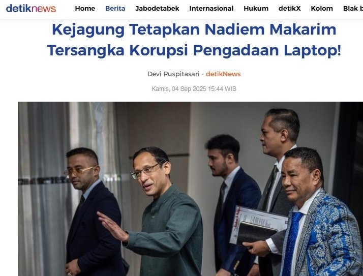 Kejaksaan Agung (Kejagung) menetapkan mantan Mendikbudristek, Nadiem Makarim, sebagai tersangka baru kasus dugaan korupsi pengadaan laptop.