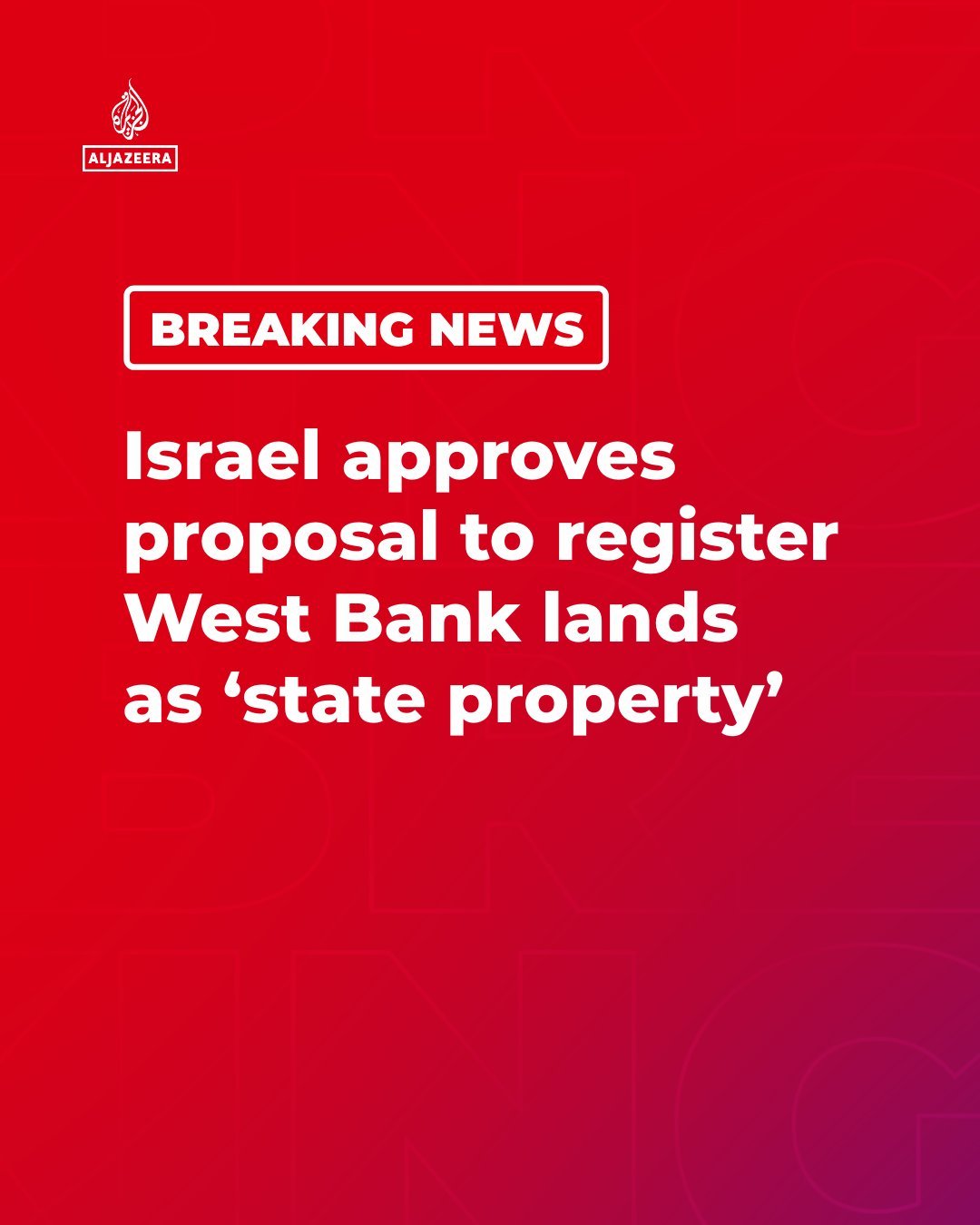 Kabinet Israel pada 15 Februari 2026 secara resmi menyetujui usulan untuk memulai proses pendaftaran tanah di Tepi Barat yang tidak dapat dibuktikan kepemilikannya oleh warga Palestina akan secara otomatis didaftarkan sebagai tanah “milik negara”.