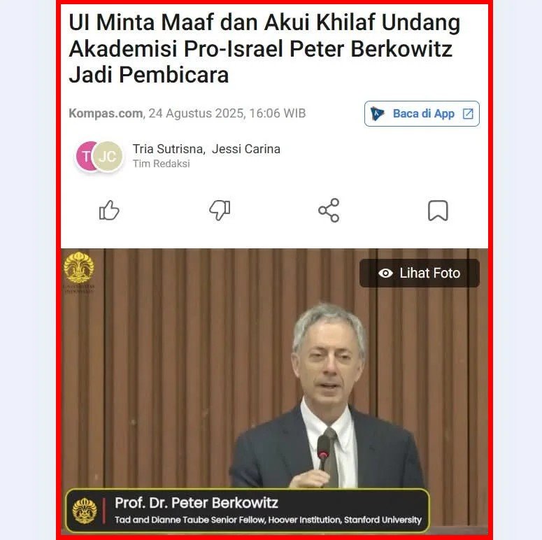 Publik tanah air dihebohkan dengan akademisi zionis pro-Israel, Peter Berkowitz, yang diundang dan menjadi pembicara dalam kegiatan Pengenalan Sistem Akademik Universitas (PSAU) Pascasarjana 2025 Universitas Indonesia (UI) pada Sabtu, 23 Agustus 2025.