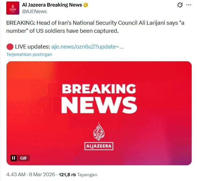 “Saya mendapat laporan bahwa beberapa tentara Amerika telah ditawan. Namun, pihak Amerika mengklaim bahwa mereka tewas dalam pertempuran. Terlepas dari upaya mereka yang sia-sia, kebenaran bukanlah sesuatu yang dapat mereka sembunyikan terlalu lama,” kata Ali Larijani di akun X, Minggu (8/3/2026).