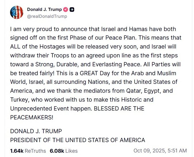 Saya sangat bangga mengumumkan bahwa Israel dan Hamas telah menandatangani Tahap pertama Rencana Perdamaian kami. Ini berarti SEMUA Sandera akan segera dibebaskan, dan Israel akan menarik pasukan mereka ke garis yang disepakati sebagai langkah pertama menuju Perdamaian yang Kuat, Bertahan Lama, dan Abadi. Semua Pihak akan diperlakukan secara adil! Ini adalah Hari yang LUAR BIASA bagi Dunia Arab dan Muslim, Israel, semua Negara di sekitarnya, dan Amerika Serikat, dan kami berterima kasih kepada para mediator dari Qatar, Mesir, dan Turki, yang telah bekerja sama dengan kami untuk mewujudkan Peristiwa Bersejarah dan Belum Pernah Terjadi Sebelumnya ini. TERBERKAHILAH PARA PEMBAWA PERDAMAIAN!