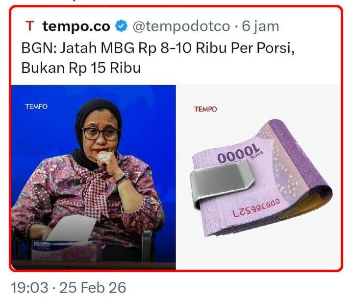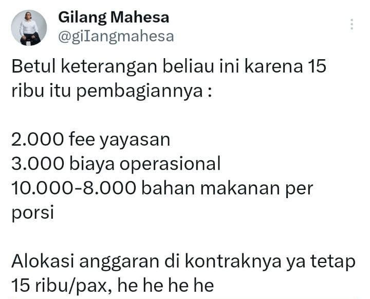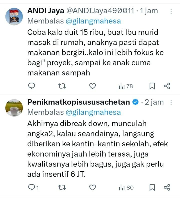 “Coba kalo duit 15 ribu, buat Ibu murid masak di rumah, anaknya pasti dapat makanan bergizi..kalo ini lebih fokus ke bagi2 proyek, sampai ke anak cuma makanan sampah,” komen netizen X @ANDIJaya490011.
