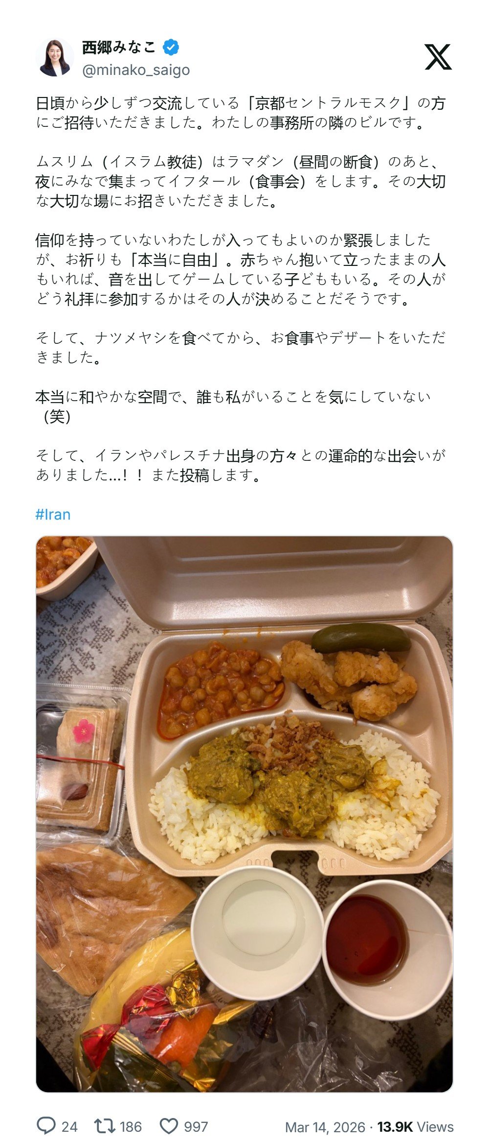 Minako Saigo (seorang ibu bergelar PhD di bidang Pendidikan, pernah menjabat selama 5 tahun sebagai presiden PTA di sebuah sekolah dasar di Kota Kyoto), menceritakan saat dirinya diundang acara ifthar/bukber Ramadan di Islamic Center Kyoto, Jepang.