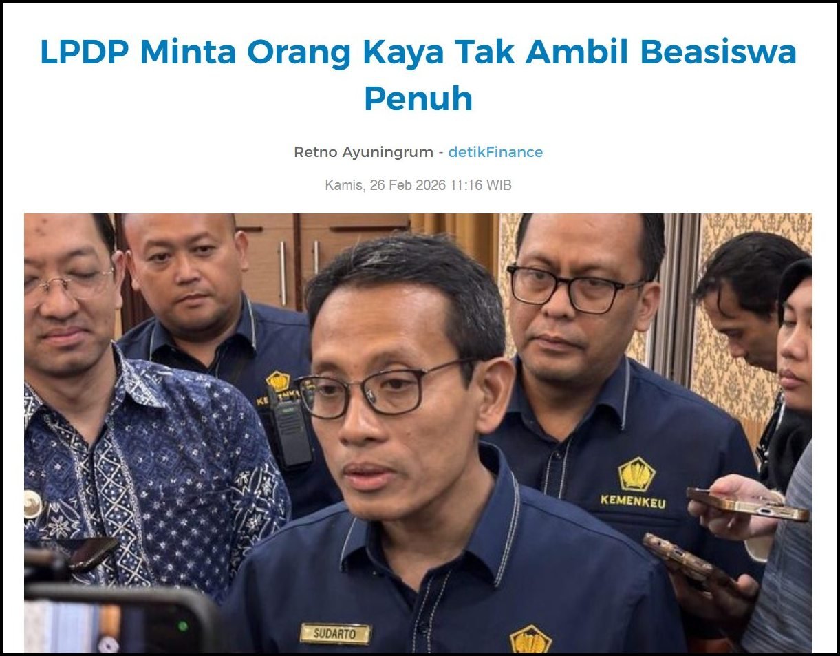 Nah, jika kamu mendadak menghimbau orang kaya agar tidak ambil beasiswa penuh; sementara peraturannya tidak bilang begitu, peraturannya bilang siapapun boleh daftar, MAKA kamu benar-benar menabuh gendang, agar netizen terus berjoget membahas soal ini. Membuat mereka lupa MBG terus pesta pora, argonya jalan tiap hari, triliun demi triliun mengalir deras.