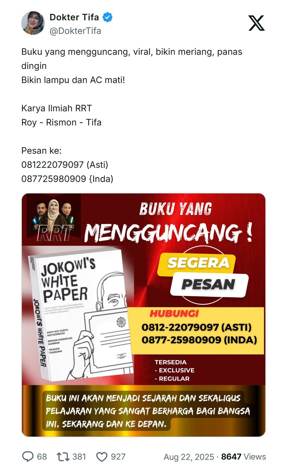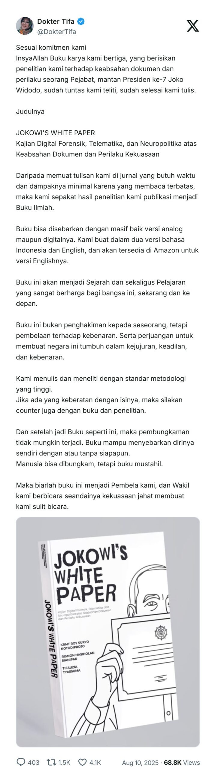InsyaAllah Buku karya kami bertiga, yang berisikan penelitian kami terhadap keabsahan dokumen dan perilaku seorang Pejabat, mantan Presiden ke-7 Joko Widodo, sudah tuntas kami teliti, sudah selesai kami tulis.