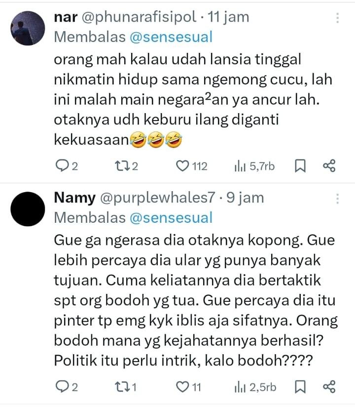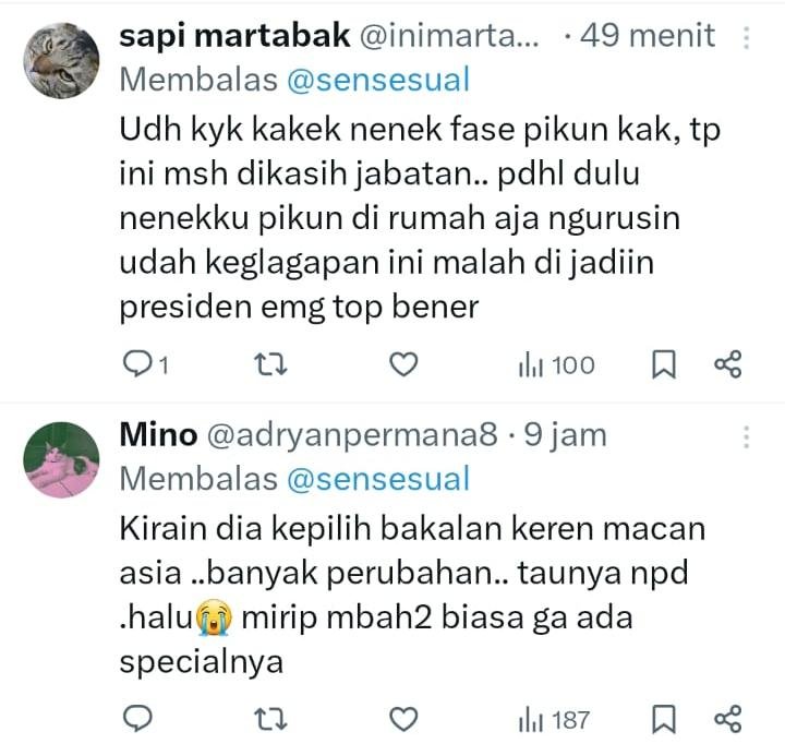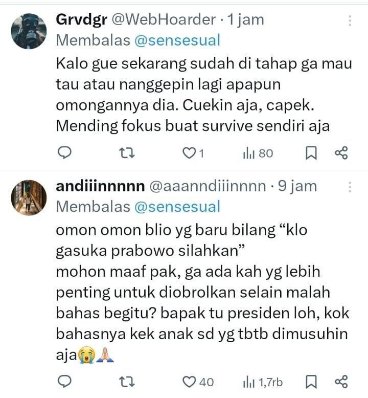 “gue kaya udah capek banget sama negara ini ngomong sama prabowo tuh kaya ngadepin mbah2 kolot yang otaknye kopong tapi dikasih tau kaga nangkep2 tapi sok tau, semaunya sendiri, sesuka-suka dia aja, ancur satu ancur sedunia. goblok dipek dewe,” ujar netizen X.