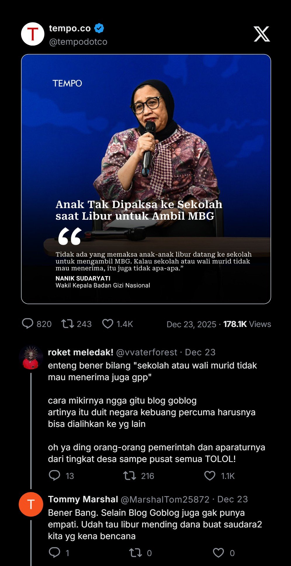 “Ada wilayah yang lebih membutuhkan dana ini sekarang, ketimbang dompet konglomerat yang sudah penuh. Jadikan libur sekolah ini untuk mengevaluasi MBG, bukan dijadikan waktu untuk balik modal lebih cepat pemilik SPPG,” kata Nailul dalam keterangan tertulis, Selasa, 23 Desember 2025.
