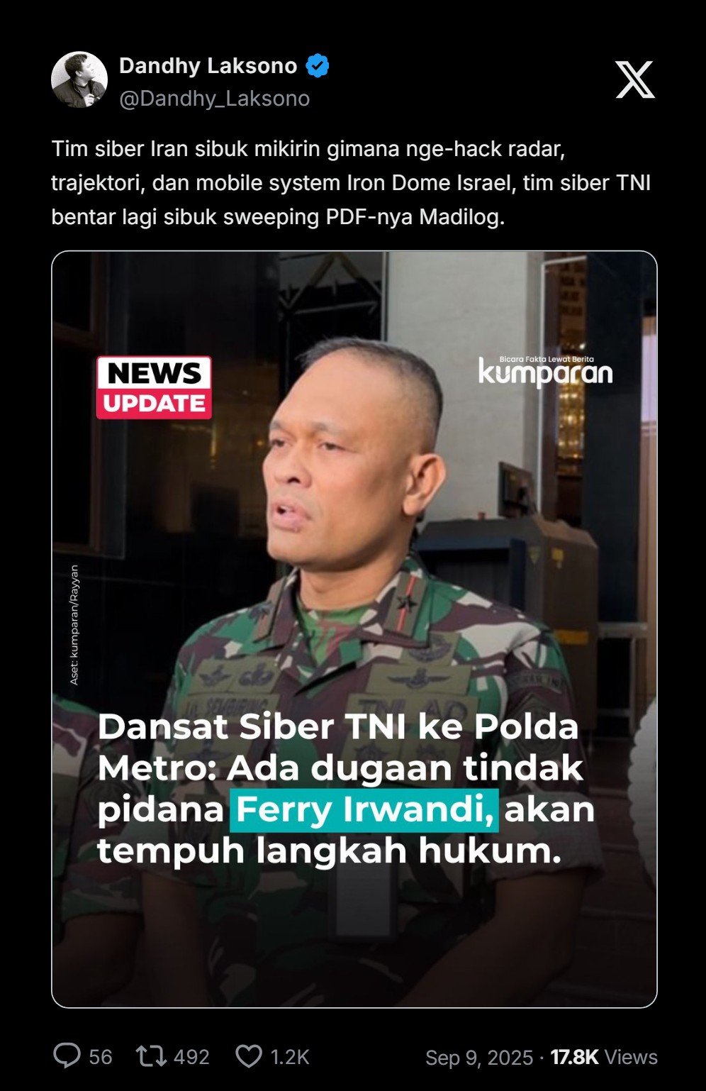 Catatan Kritis Atas Langkah Hukum Dansatsiber TNI terhadap CEO Malaka Project Ferry Irwandi