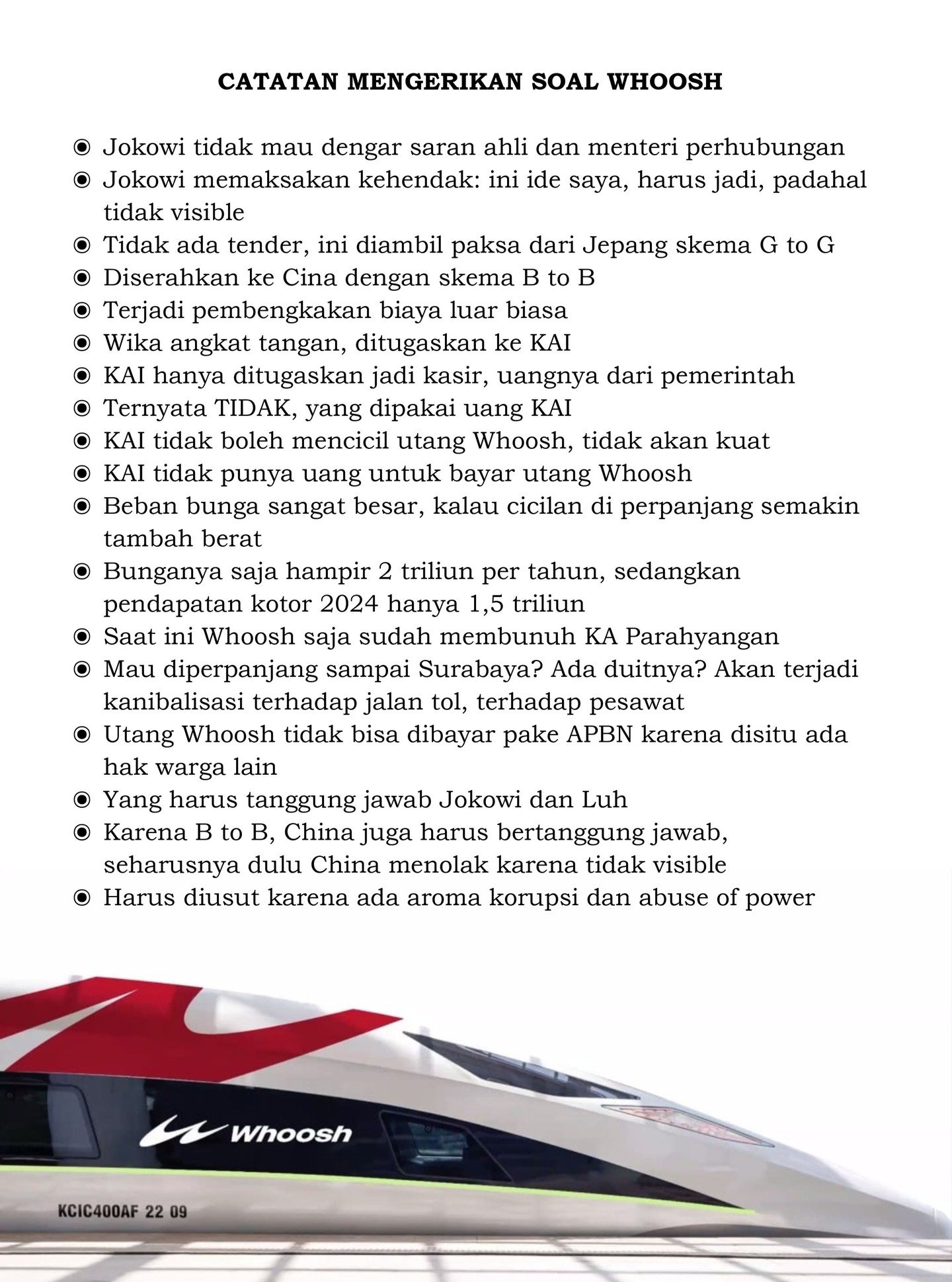 - Utang Whoosh tidak bisa dibayar pakAI APBN karena disitu ada hak warga lain
