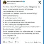Said Didu: Calon Investor Singapura membatalkan komitmen, sampai Presiden bisa stabilkan kondisi dan lepas dari bayang-bayang rezim lama CATATAN|Sabtu, 30 Agustus, 2025oleh Admin Muhammad Said Didu: Kebetulan ketemu “konsultan” investor di Singapura – dia pusing
