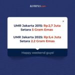 UMR Jakarta dulu setara 5 gram emas, sekarang cuma 2 gram emas RAGAM|Minggu, 5 Oktober, 2025oleh Admin 🟠UMR Jakarta 2015: Rp 2,7 Juta setara 5 Gram Emas 🔵UMR Jakarta