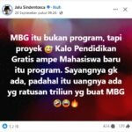 MBG itu bukan program, tapi proyek Seputar MBG|Selasa, 30 September, 2025oleh Admin MBG itu bukan program, tapi proyek 😅 Kalo Pendidikan Gratis ampe Mahasiswa