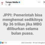 JPPI: Hemat Rp 36 Triliun jika MBG Dihentikan Selama Ramadan Seputar MBG|Rabu, 21 Januari, 2026Rabu, 21 Januari, 2026oleh Admin JPPI: Hemat Rp 36 Triliun jika MBG Dihentikan Selama Ramadan Jaringan Pemantau