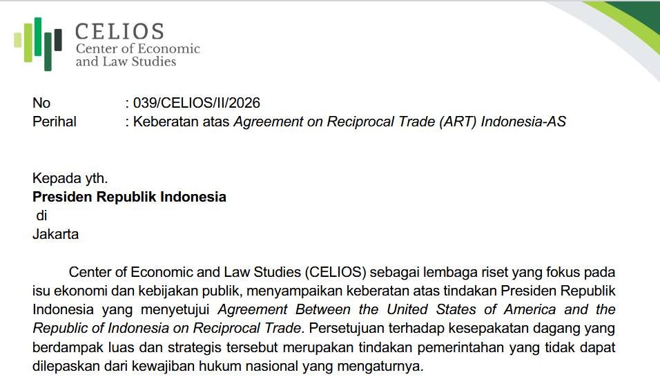 Pusat Studi Ekonomi dan Hukum (CELIOS – The Center of Economic and Law Studies) menyampaikan kepada Presiden Republik Indonesia yang menyatakan keberatannya terhadap Perjanjian Perdagangan Timbal Balik antara Amerika Serikat dan Republik Indonesia (ART).