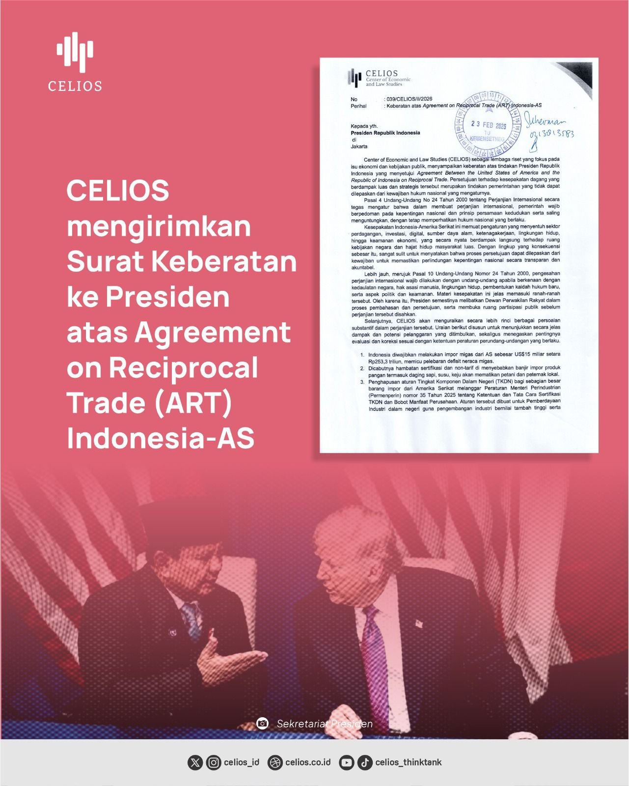 Pusat Studi Ekonomi dan Hukum (CELIOS – The Center of Economic and Law Studies) menyampaikan kepada Presiden Republik Indonesia yang menyatakan keberatannya terhadap Perjanjian Perdagangan Timbal Balik antara Amerika Serikat dan Republik Indonesia (ART).