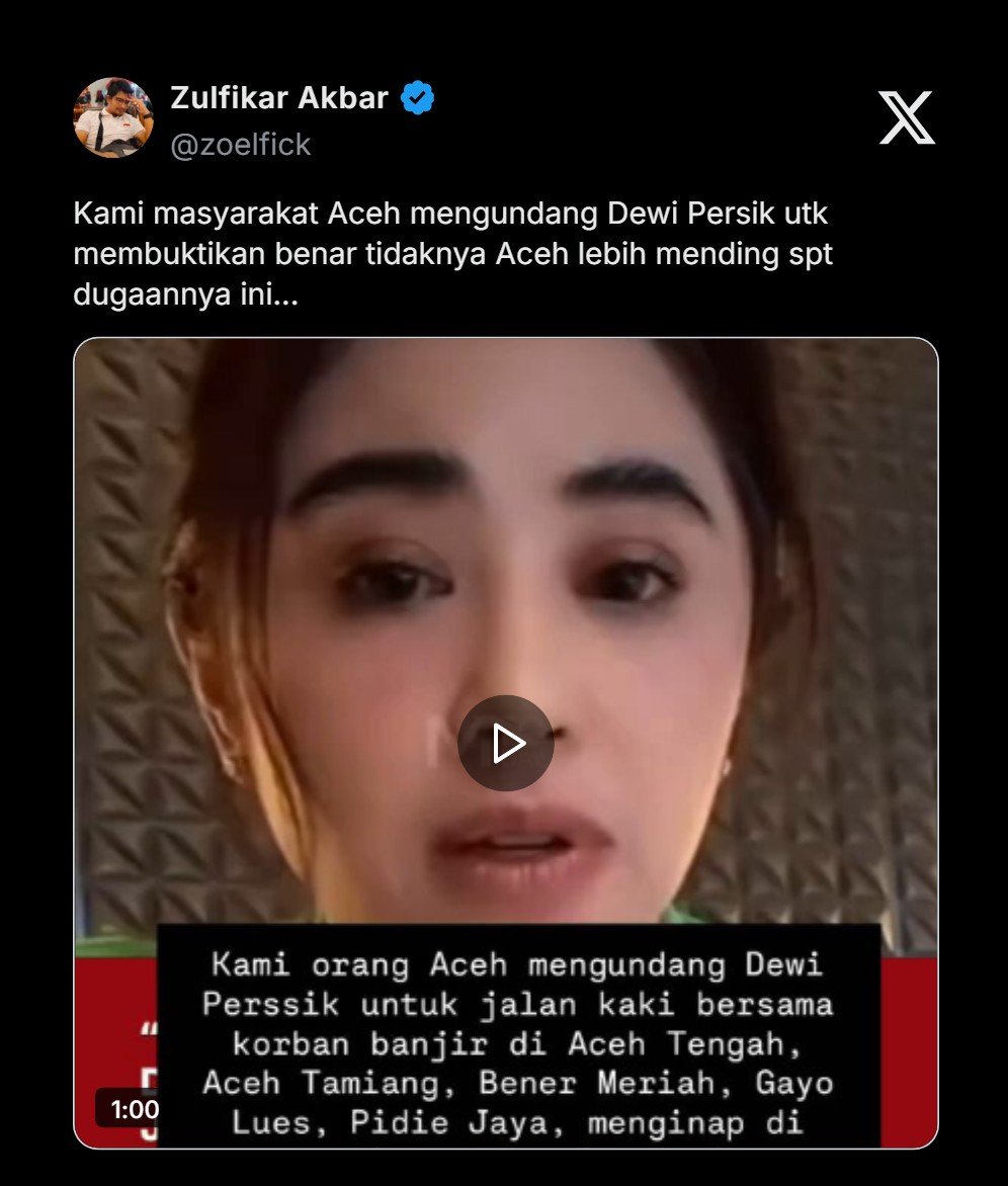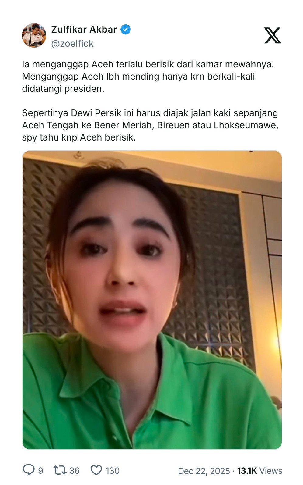 Sepertinya Dewi Persik ini harus diajak jalan kaki sepanjang Aceh Tengah ke Bener Meriah, Bireuen atau Lhokseumawe, spy tahu knp Aceh berisik,” ujar Zulfikar Akbar @zoelfick.