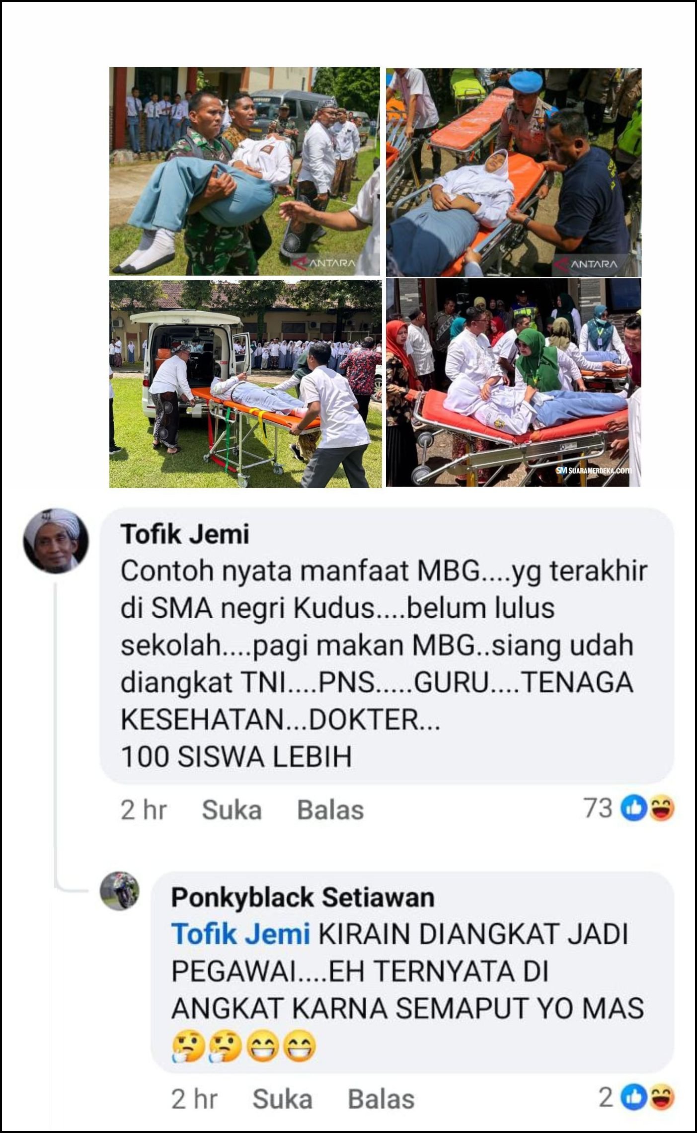 “Contoh nyata manfaat MBG….yg terakhir di SMA Negeri Kudus….belum lulus sekolah….pagi makan MBG..siang udah diangkat TNI….PNS…..GURU….TENAGA KESEHATAN…DOKTER…