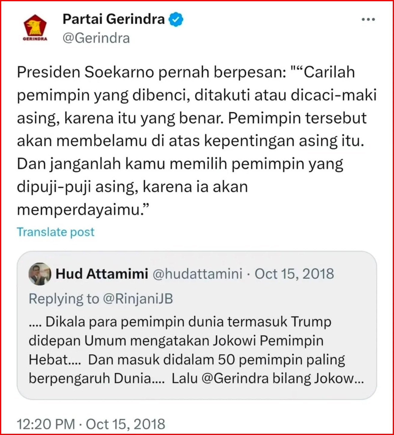 Namun di media sosial netizen kembali mengunggah postingan/twit lama dari akun resmi Partai Gerindra tahun 2018 yang mengutip pernyataan Presiden Soekarno.