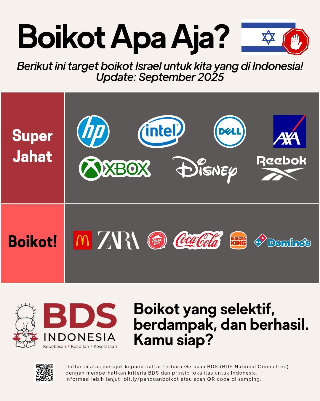๐ข Gerakan Boikot, Divestasi, dan Sanksi (BDS) sedunia sudah mengumumkan daftar boikot terbaru. Buat kamu yang pengen boikot selektif, berdampak, dan berhasil, kami siapkan diagram ini biar ga bingung lagi ๐๐ผ