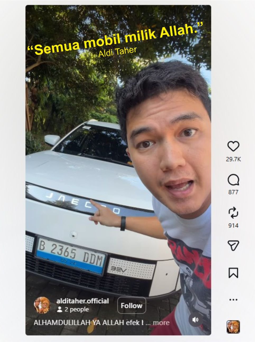 “Semua mobil milik Allah”, begitu kata Aldi Taher saat mendapat endorse mobil listrik dari produsen otomotif asal China, Jaecoo. Alih-alih dipakai sendiri, dia memberikan kendaraan tersebut untuk keluarga.