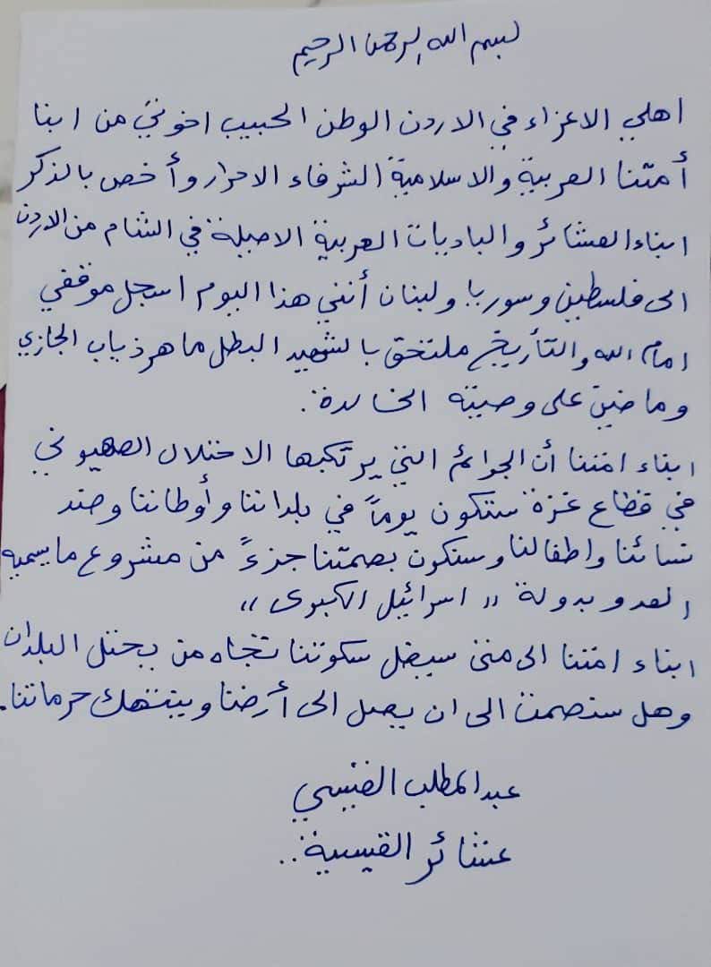 Surat wasiat warga Yordania yang syahid setelah menewaskan dua tentara Israel di Perlintasan Al-Karameh, perbatasan Yordania-Israel: