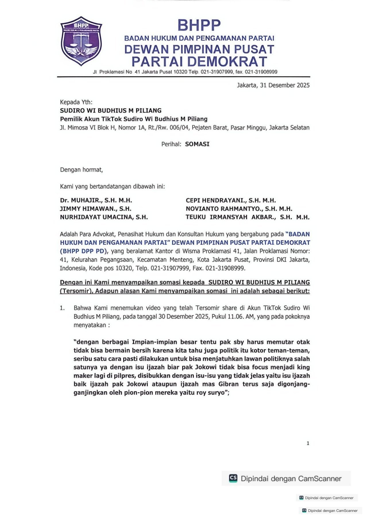 Baru sehari video Andi Arief yang berisi peringatan terhadap pihak-pihak yang mengaitkan SBY dengan kasus ijazah Jokowi, yang disebarkannya lewat akun X-nya, hari ini surat somasi terhadap Budhius M Piliang sudah dilayangkan dan beredar di media sosial.