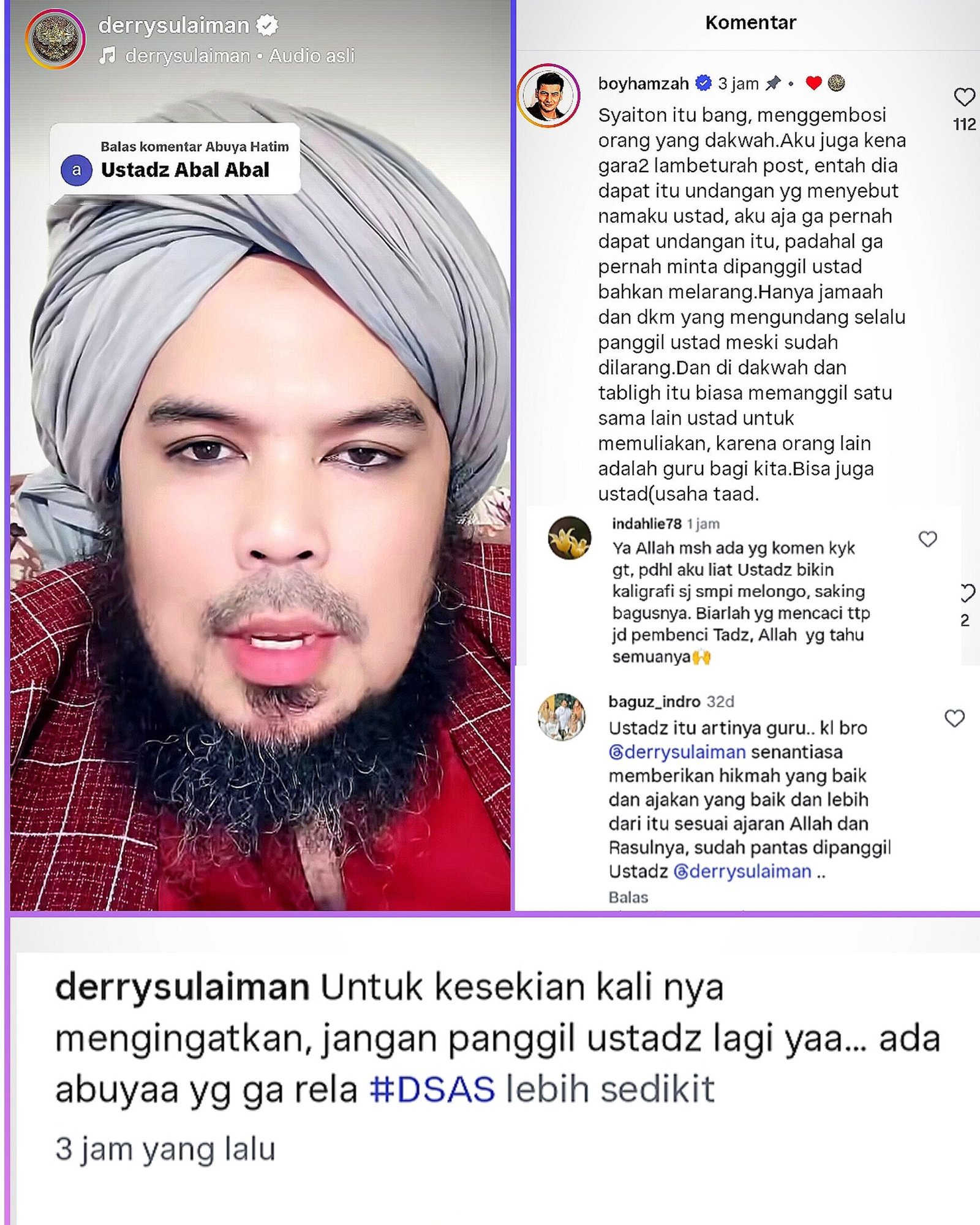 “Saya sudah sering berkali-kali mengingatkan netizen untuk tidak memanggil saya ustadz, karena saya hanyalah seorang seniman yang berdakwah, saya adalah seorang pelukis, seorang pemusik yang hari-hari mengajak manusia kepada Allah, untuk ikut Rasulullah, bukan ikut saya, jadi mohon difahami bahwa saya belum pernah mendeklarasikan diri sebagai ustadz. Jadi kalau dibilang ustadz abal-abal ya memang benar. Saya bukan ustadz. Kalau orang-orang ada yang memanggil saya ustadz ya makasih banget,” kata Derry Sulaiman dalam video di akun Instagramnya.