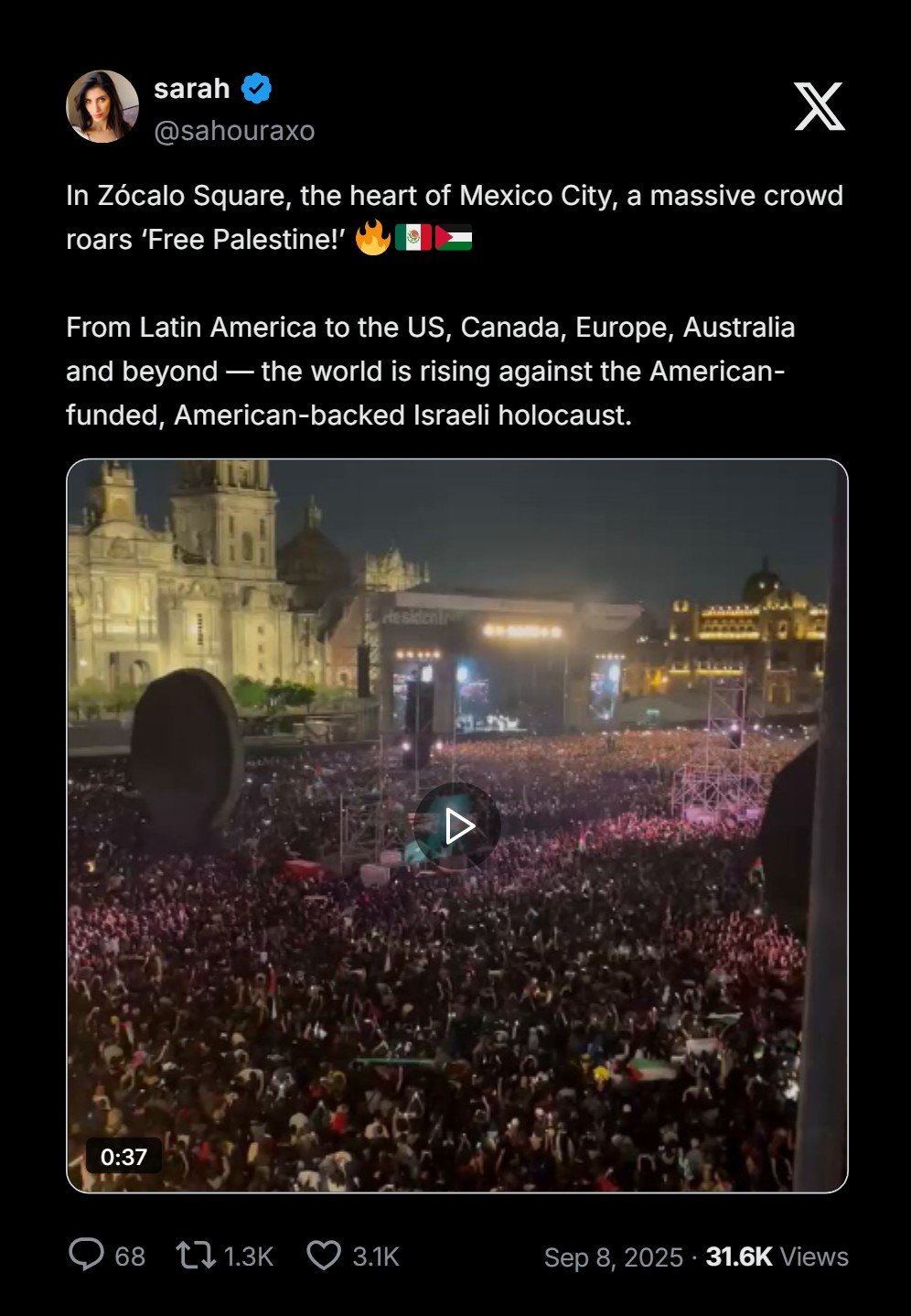 Di Lapangan Zócalo, jantung Kota Meksiko, kerumunan besar massa meneriakkan ‘Bebaskan Palestina!’ 🔥
