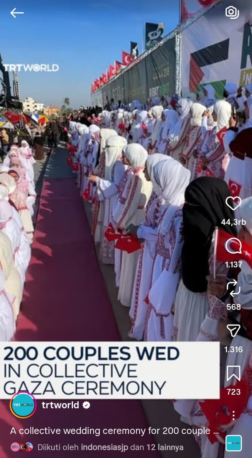 Di momen sebelumnya, dunia menyaksikan puluhan pasangan muda-mudi Gaza menggelar pesta pernikahan dengan latar reruntuhan kota gaza yang hancur… dengan kondisi serba sulit, mereka tetap berusaha memupuk harapan dan menyunggingkan senyum menyongsong fase baru dalam kehidupan mereka….