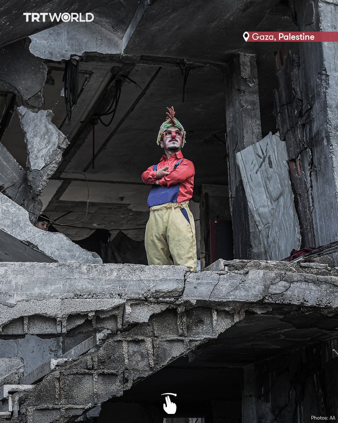 Namun di tengah kehancuran itu, ia menjadi sukarelawan sebagai badut, berpegang teguh pada kehidupan dengan membawa tawa dan kegembiraan sesaat kepada anak-anak yang telah mengalami terlalu banyak kehilangan.