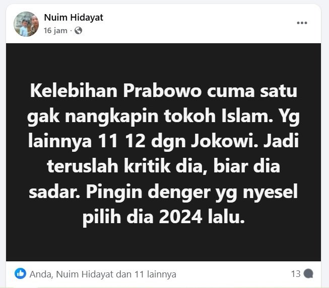 “Kelebihan Prabowo cuma satu gak nangkapin tokoh Islam. Yg lainnya 11 12 dgn Jokowi. Jadi teruslah kritik dia, biar dia sadar. Pingin denger yg nyesel pilih dia 2024 lalu,” ujar ustadz Nuim Hidayat dikutip dari akun facebooknya.