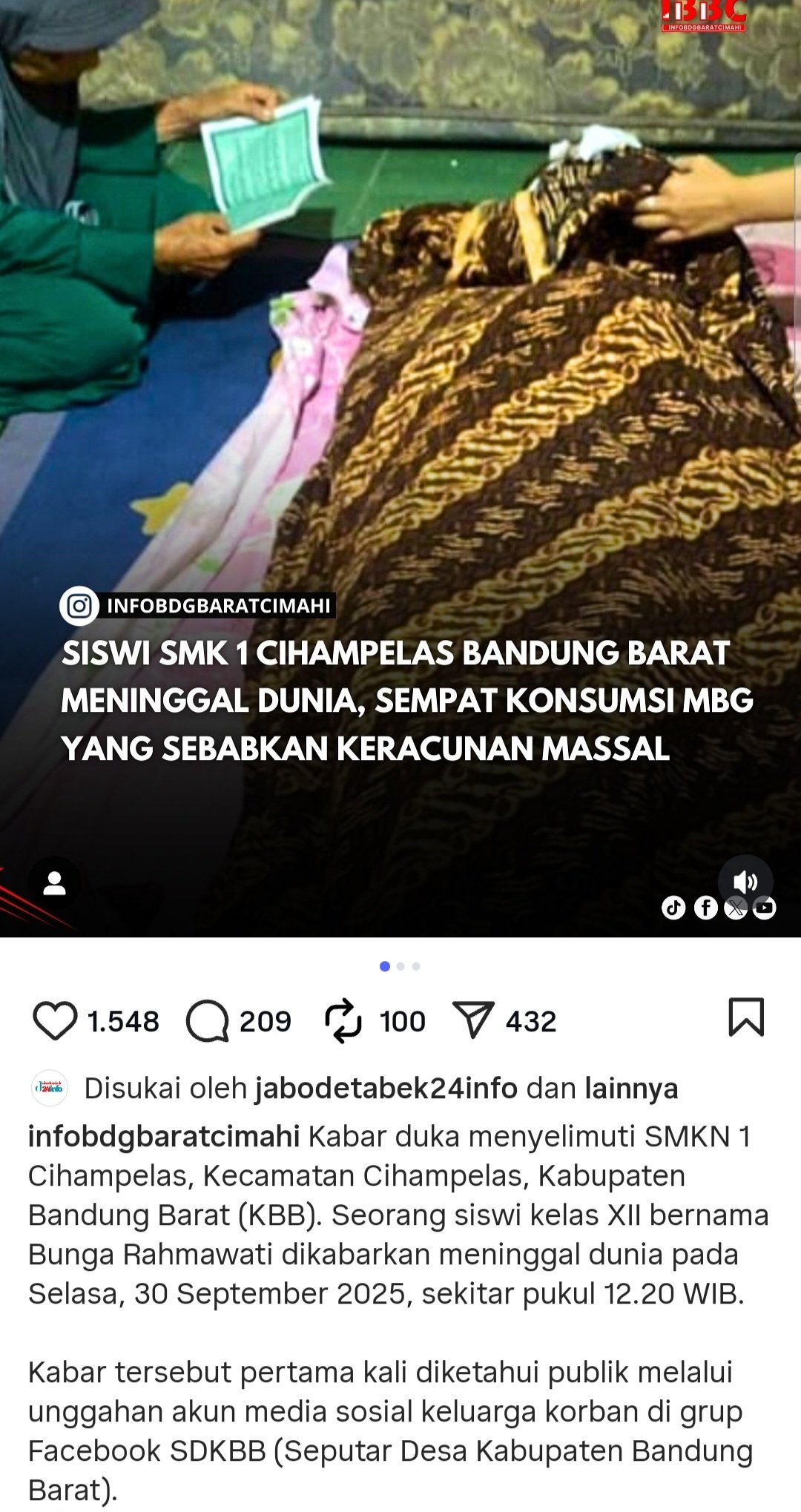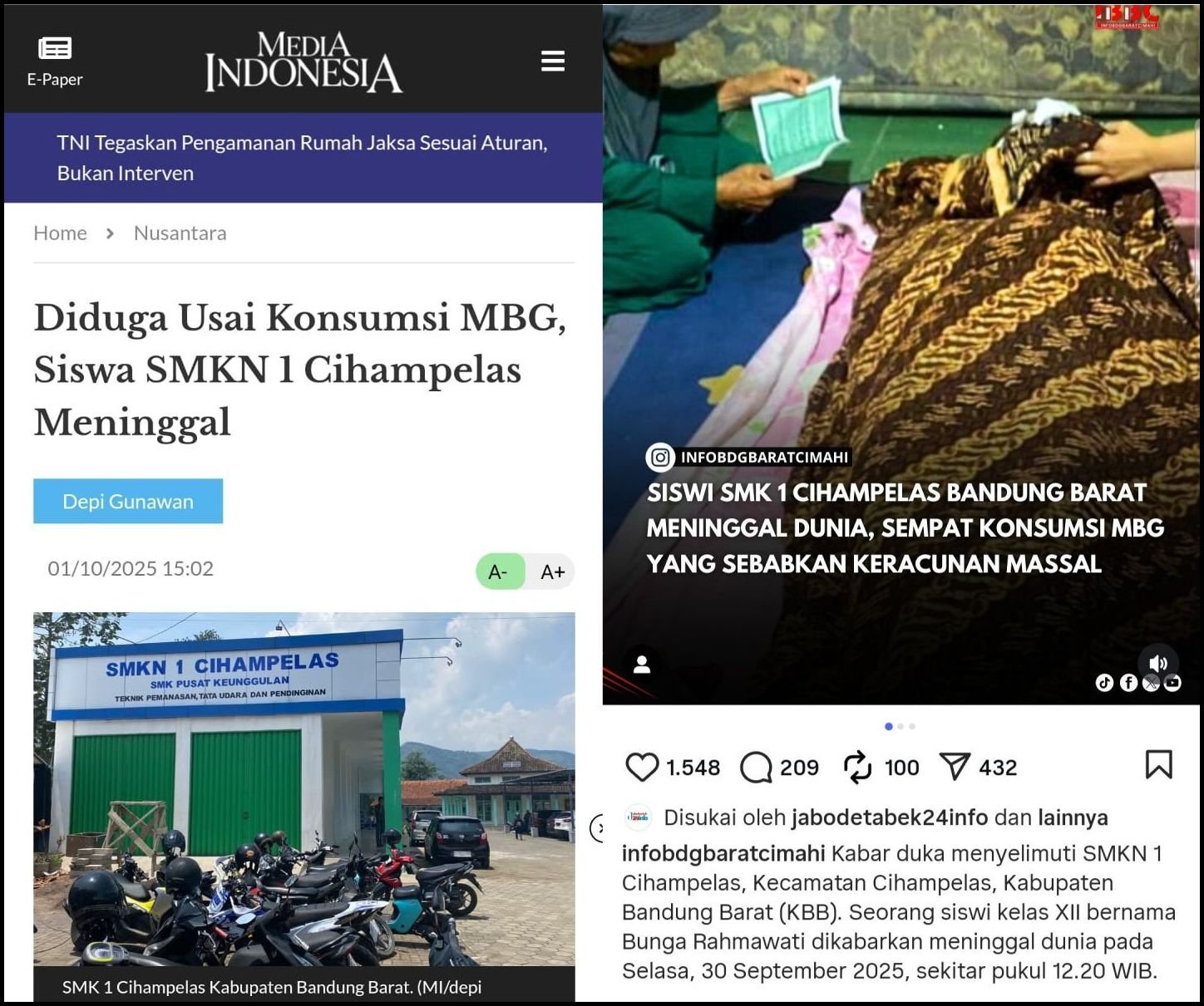 Siswa bernama Bunga Rahmawati meninggal pada Selasa (30/9/2025) kemarin. Pada waktu kejadian Rabu, (24/9/2025) lalu ia menjadi salah satu penerima paket MBG yang dibagikan kepada ratusan siswa SMKN 1 Cihampelas.